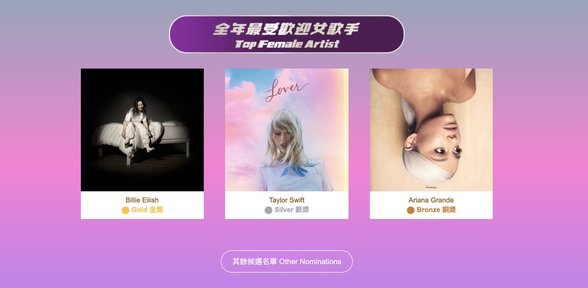 Billie won 3 gold awards at the 2020 rthk international pop poll awards: